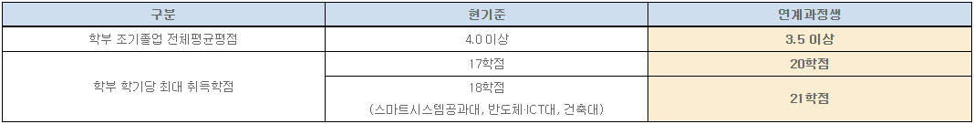 다. 전체 평점평균이 3.5 이상 4.0 미만일 경우 학사 조기 졸업 후 대학원 1학기 등록을 반드시 필요해야함